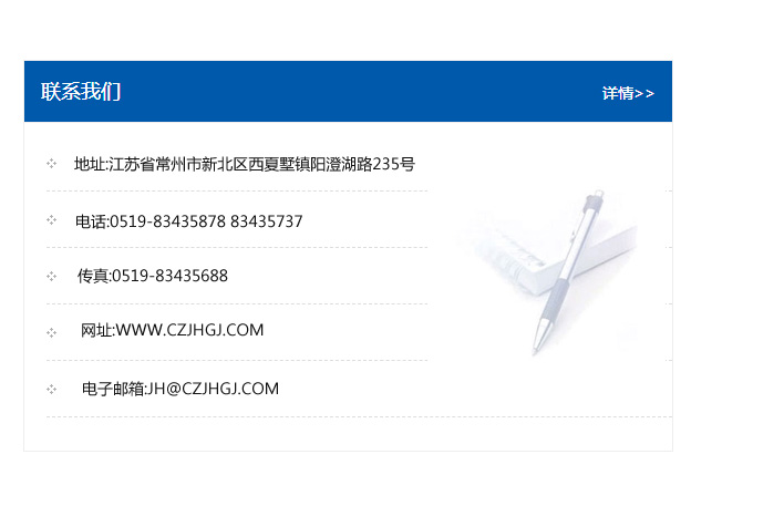 地址:常州市新北區(qū)友邦商務(wù)大廈1幢16、17層  電話:0519-85101652  傳真:0519-85112595  郵編:213022  網(wǎng)址:www.cz-jiayue_cn.my-love-photo.com  郵箱:xiajifengaa@163.com